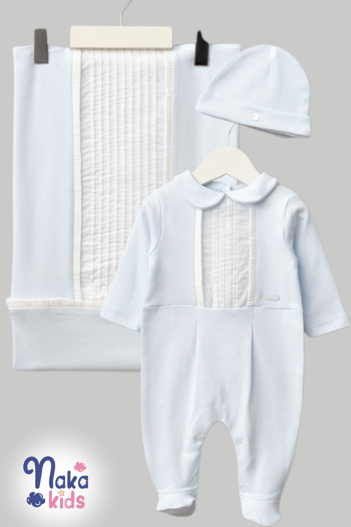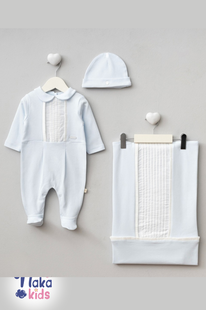 Set, yenidoğan bebekler için özenle tasarlanmış 3 parçadan oluşur: