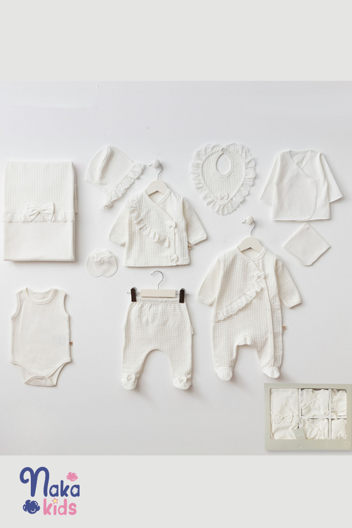- Paket içeriği 10 parça olup; battaniye, tulum, pijama üst- alt, eldiven, önlük, şapka, iç zıbın, body, mendilden oluşmaktadır.