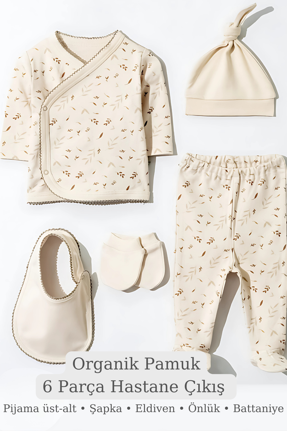 Yenidoğan bebekler için özel olarak tasarlanmış, yumuşak dokulu ve konforlu 6 parça set.