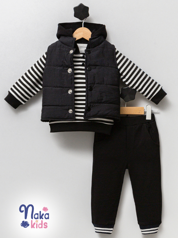 Yumuşak dokulu pamuklu kumaşı sayesinde çocukların hassas cildine dosttur. Şişme yeleğiyle soğuktan korur, kapüşonlu çizgili üst ise dinamik ve modern bir görünüm kazandırır. Siyah ribanalı eşofman altı, esnek beliyle konfor sağlar ve cepleriyle kullanışlıdır.