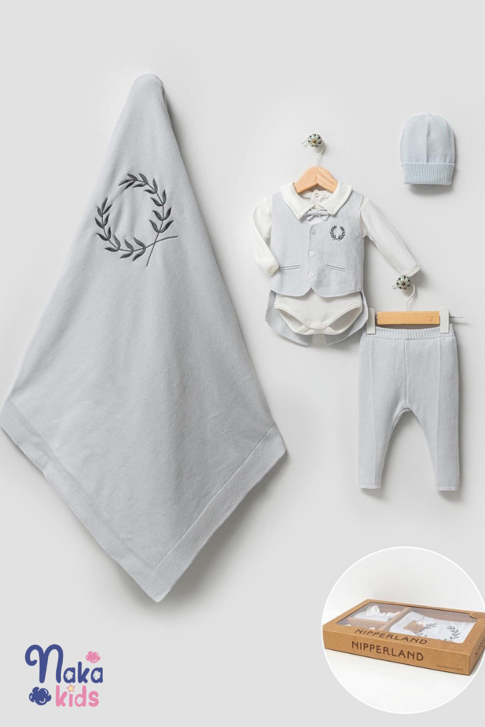Setimiz, her biri özenle seçilmiş ve tasarlanmış olan 1 adet battaniye, 1 adet yelek, 1 adet body, 1 adet şapka ve 1 adet pantolondan oluşmaktadır. Bu parçalar, bebeğinizin ilk günlerinde ihtiyacı olan her şeyi sağlar ve aynı zamanda stilini de yansıtır.